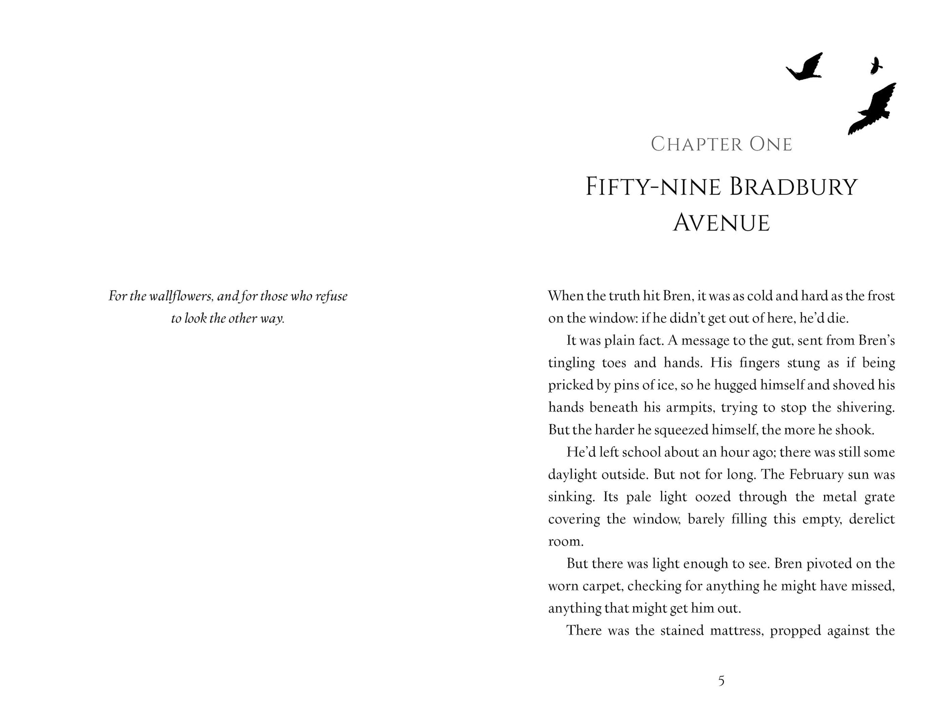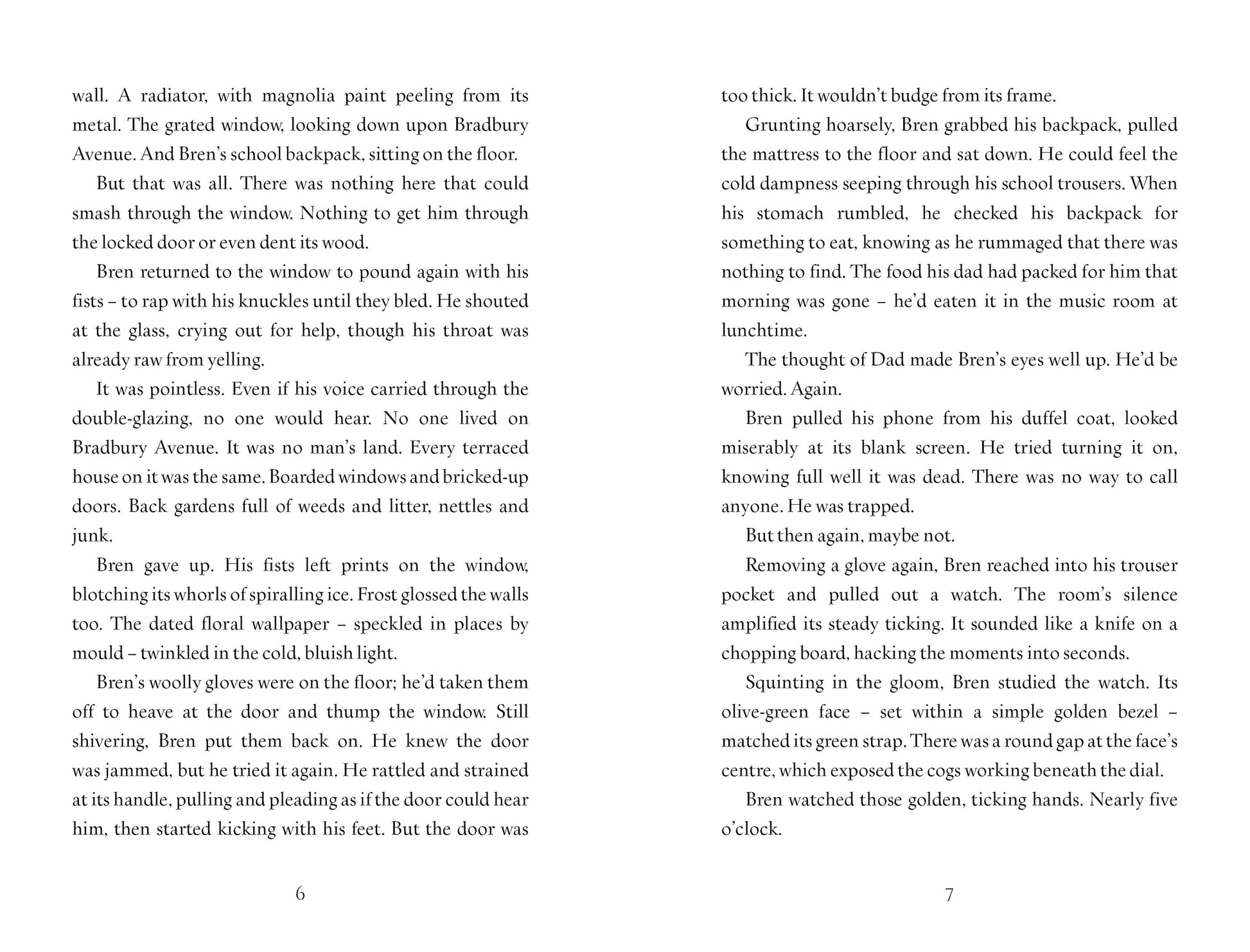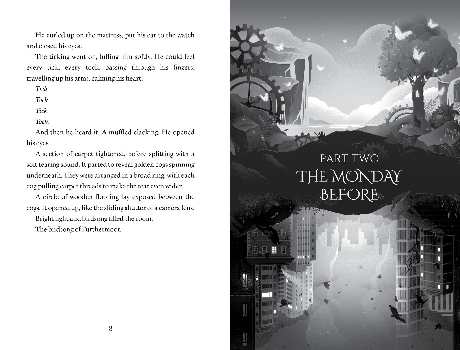 The real world is a hostile place for twelve-year-old Bren, his schooldays stalked by vicious bully, Shaun, and his family life fractured at home. Ever since his sister Evie died in an accident, Bren's only safe space is Furthermoor, an imagined world of mechanised trees and clockwork animals, where Evie is still alive. In Furthermoor, no one can hurt Bren...until the mysterious Featherly arrives.